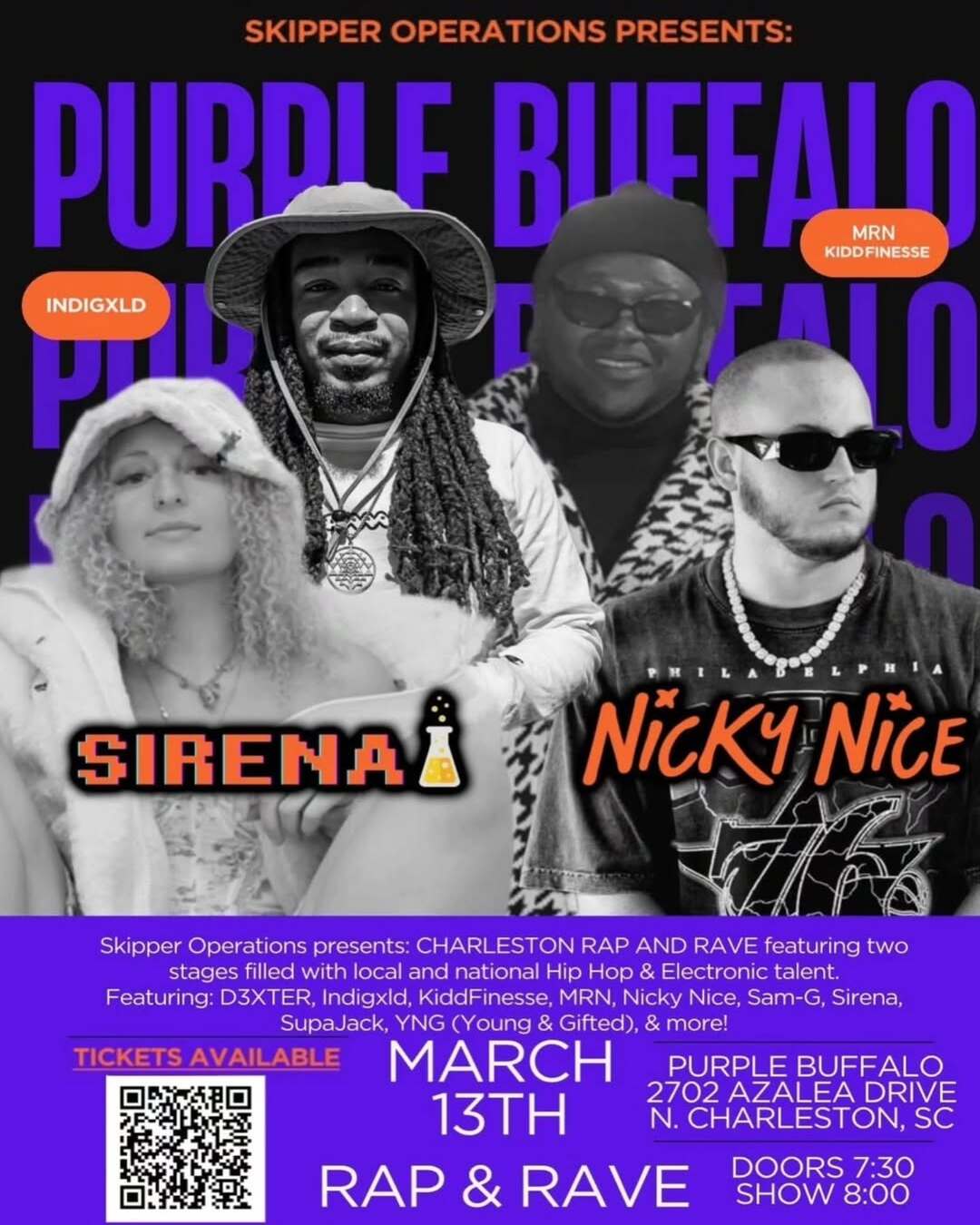 Get ready for a night of live music, heavy energy, and two-stage entertainment at Charleston Rap & Rave on March 13 at Purple Buffalo. This North Charleston event brings together local and national hip hop and electronic artists for a lineup that includes Sirena, Nicky Nice, D3XTER, Indigxld, KiddFinesse, MRN, Sam-G, SupaJack, YNG (Young & Gifted), and more. Whether you’re coming for the bars, the bass, or the atmosphere, this one is shaping up to be a standout night for Charleston’s live music crowd.
