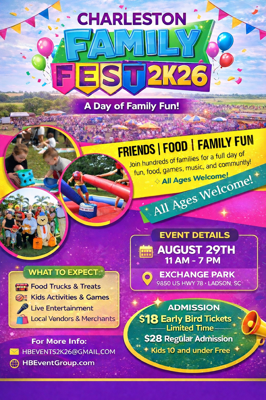Charleston Family Fest 2K26 is a one-day community celebration bringing families together for an unforgettable day of fun, entertainment, food, shopping and children's activities. Hosted by HB Event Management Group,...