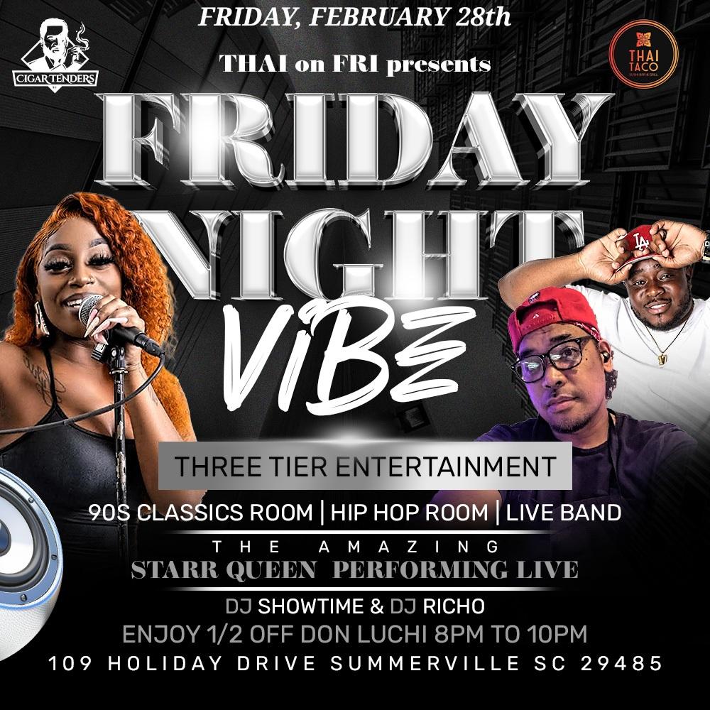Join us for a EPIC night at The Thai with LIVE performances by Starr Queen and DJ Showtime & DJ RICHO with ALL 90s Vibe!!!THREE TIER ENTERTAINMENTCigars Available by Cigar Tenders and Food Provided by Sweetgrass Chef Rio8pm - 9pm - Cocktail Hour ( Specials) sponsored by Don Luchi ChampagneLIVE BAND - 9pm to 1pm...