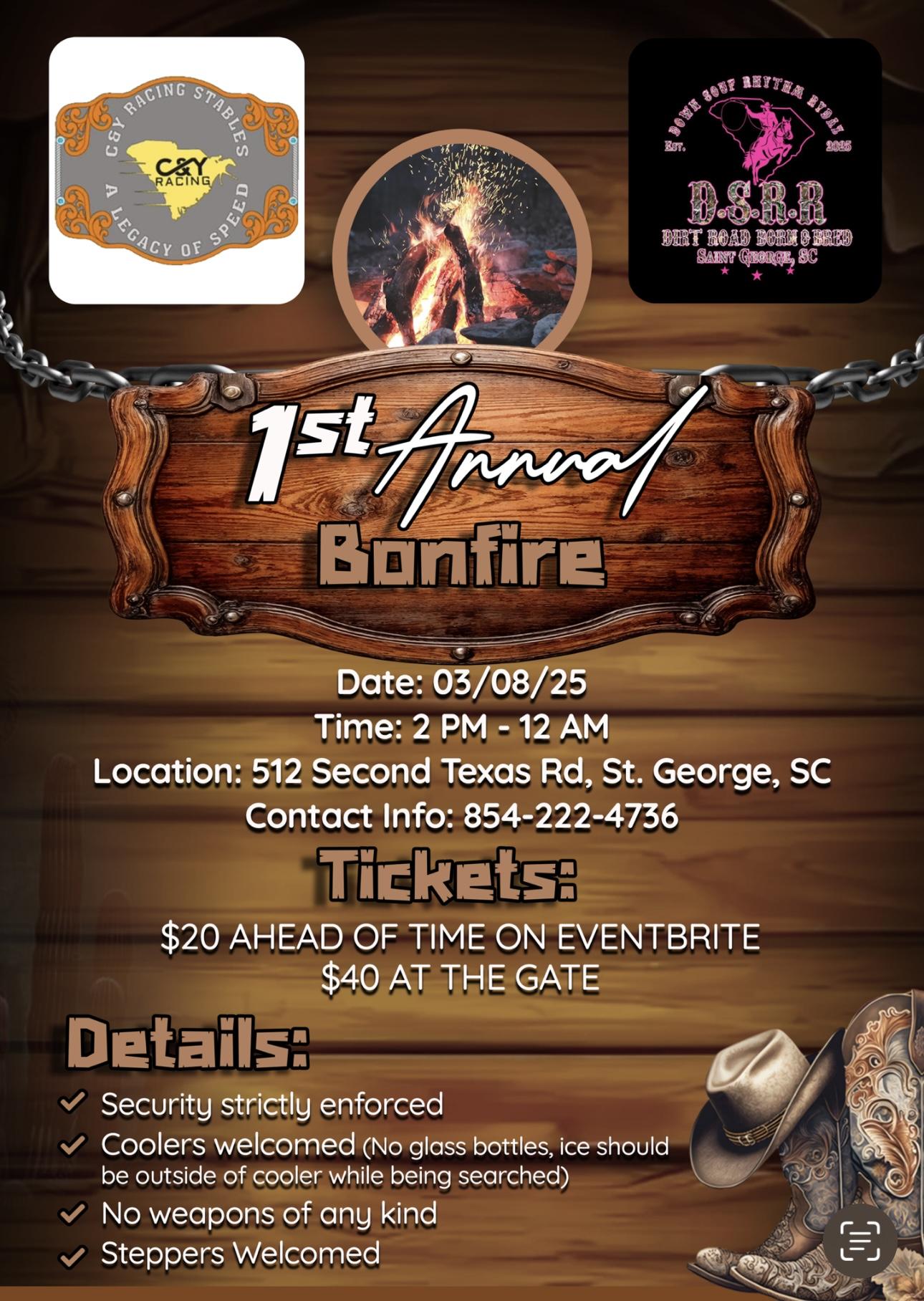 Get ready for a night of fun, music, and s'mores at our 1st Annual Bonfire - it's gonna be lit!Welcome to the 1st Annual Bonfire!Come join us for a night of fun, music, bull rides and line dancing at 512 Second Texas Rd. Get ready to gather around the fire and have a good time....