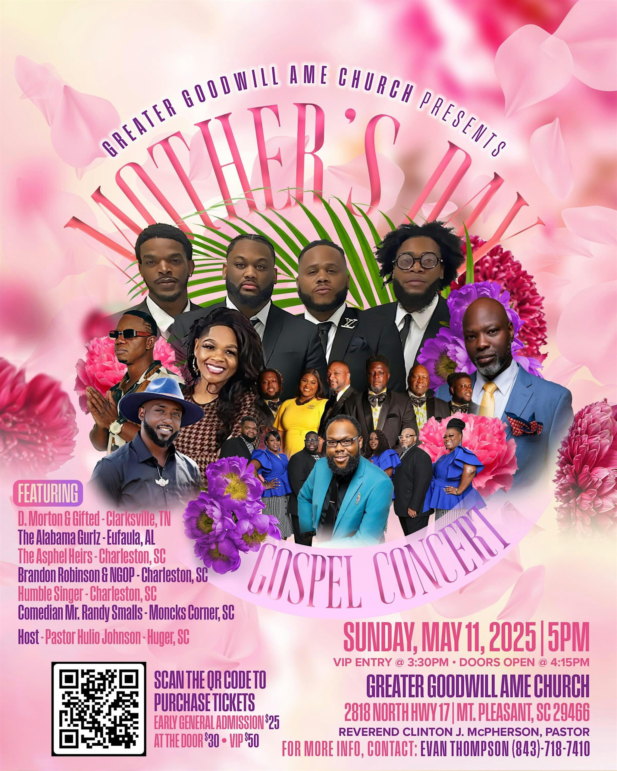 Celebrating mothers across the low country through music with some of their favorite songs.Gospel Recording Artists: D. Morton & Gifted (TN), The Alabama Gurlz (AL), The Asphel Heirs (SC), Brandon Robinson & NGOP (SC), Humble Singer & Company (SC), & Bro. Randy Smalls - Comedian (SC). Hosted by Pastor Hulio Johnson (SC).Children under 5 =...