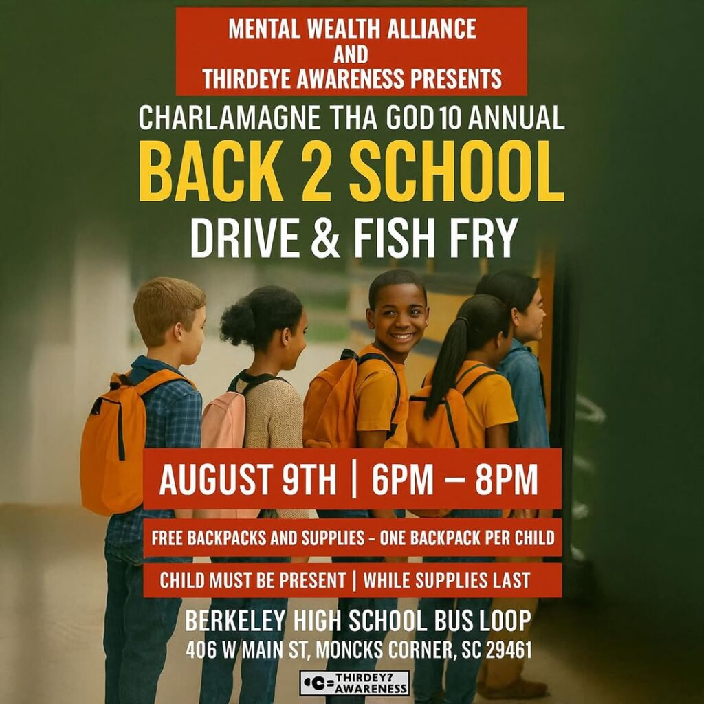 Mark your calendars, Goose Creek and surrounding areas! Charlamagne Tha God, in partnership with the Mental Wealth Alliance and ThirdEye Awareness, is bringing his highly anticipated annual Back 2 School Drive & Fish Fry back to Moncks Corner for its 10th consecutive year! This incredible community event is scheduled for Saturday, August 9th, from 6 PM to 8 PM at the Berkeley High School Bus Loop, located at 406 W Main St, Moncks Corner, SC 29461.