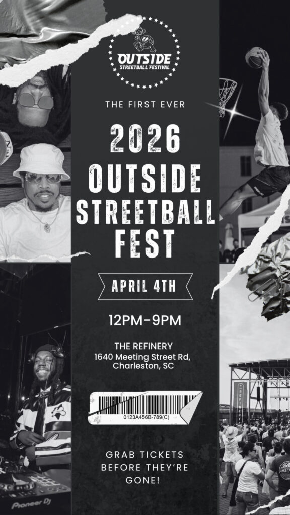 Outside Streetball Festival is bringing a one day outdoor experience to Charleston that blends basketball, music, and art into one high energy event at The Refinery. The day features a competitive 3 on 3 streetball tournament with live on court MCs keeping the energy going throughout. There will be a live dunk contest at sunset, along with performances from Nappy Roots and a full lineup of DJs including DJ DollaMenu. Throughout the event, local artists will be creating live paintings, adding to the atmosphere and making this more than just a basketball tournament. With music playing all day, interactive moments between games, food vendors, drinks, and a strong community feel, this event is designed to showcase local talent while bringing together sport, music, and culture in one place. All ages are welcome and re-entry is allowed.