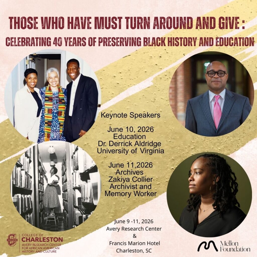 The College of Charleston’s Avery Research Center for African American History and Culture proudly presents Those Who Have Must Turn Around and Give: Celebrating 40 Years of Preserving Black History and Education, a three-day symposium, June 9-11, 2026, honoring our past and looking toward new ways to preserve the legacy of African Americans in the Lowcountry. Bringing together educators, archivists, historians, students, community scholars, and cultural workers, the symposium explores the critical intersections of Black education, archives, and community engagement. Centering Black voices, pedagogies, and memory work, the convening examines how education and archives function as tools of empowerment, resistance, and reimagination. The symposium title honors the words of Dr. Myrtle Glascoe, the Avery Research Center’s first executive director, whose leadership established the Center’s commitment to community archiving, preservation, and public scholarship. As the Avery Research Center marks its 41st anniversary and the Avery Normal Institute approaches its 161st year, this gathering reflects on legacy while imagining liberatory futures.