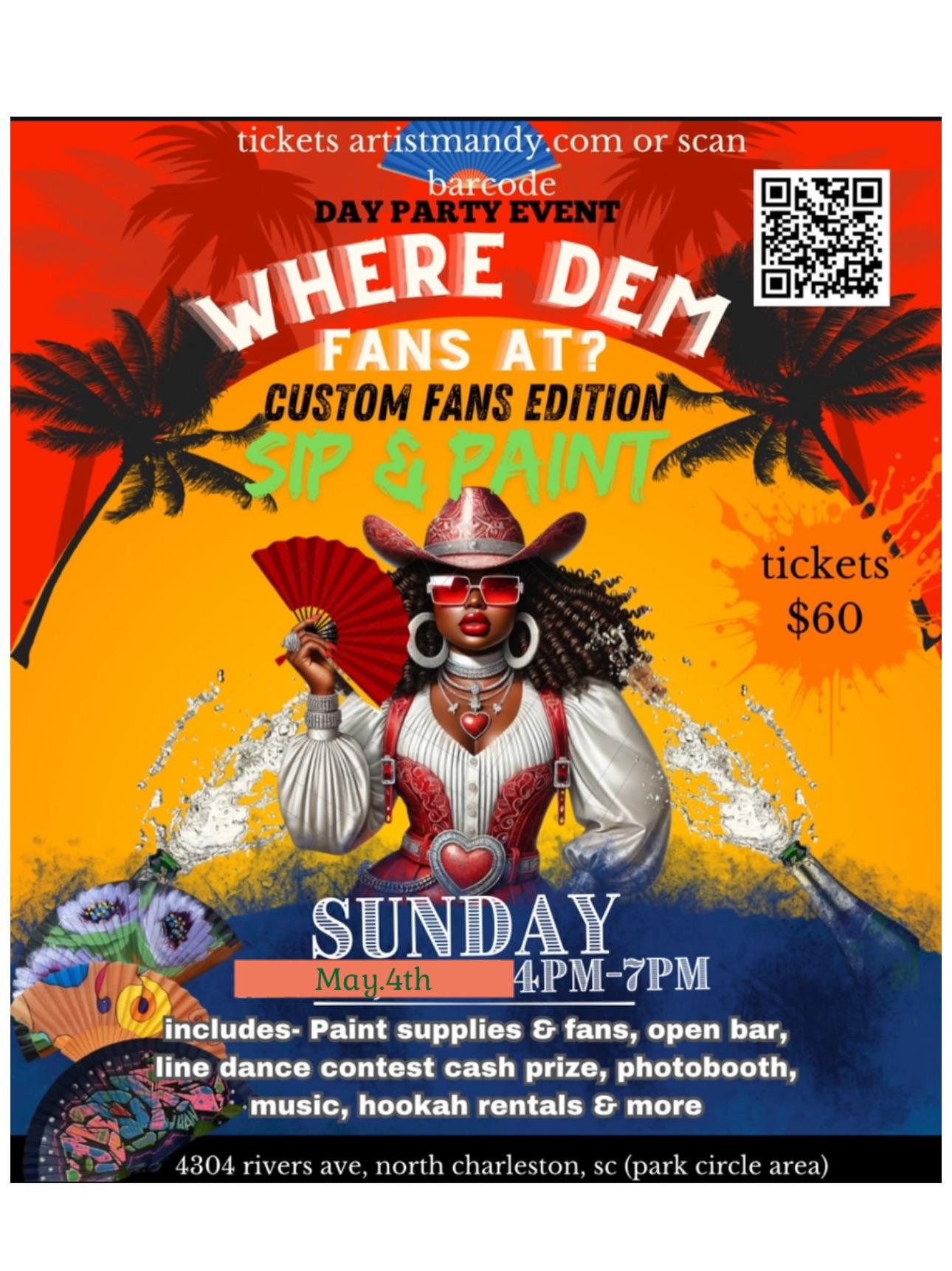 Come join us at The Empty Canvas for a fun-filled evening of painting and sipping! Whether you’re an experienced artist or just looking to have a good time, this event is perfect for everyone. Grab your friends and unleash your creativity while enjoying some drinks. No judgment here, just good vibes and great company. Let’s see where dem fans at and create some masterpieces together! Don’t miss out on this awesome event!Everything is included! we will sip & painting customizing our own fans! there will be an Open bar but you can bring outside food and drinks!