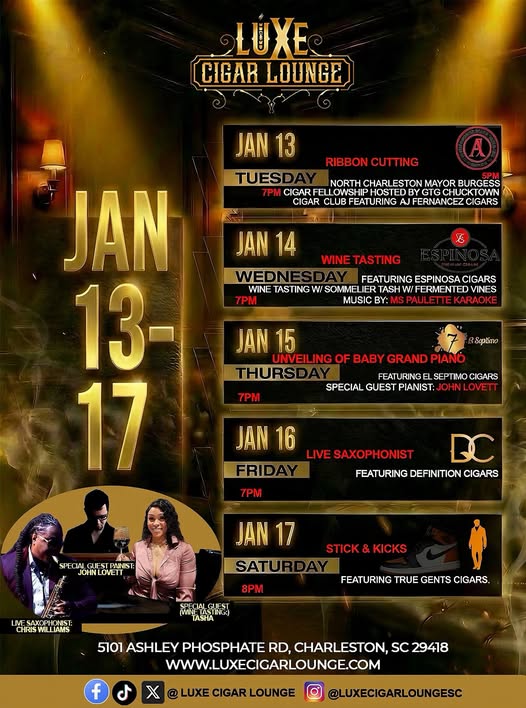 Charleston is preparing for a new level of sophistication as Luxe Cigar Lounge officially opens its doors. From January 13th through January 17th, the lounge will host a premier five-day Grand Opening celebration at its new location at 5101 Ashley Phosphate Rd. The week promises a refined blend of premium tobacco, live artistry, and community prestige.
